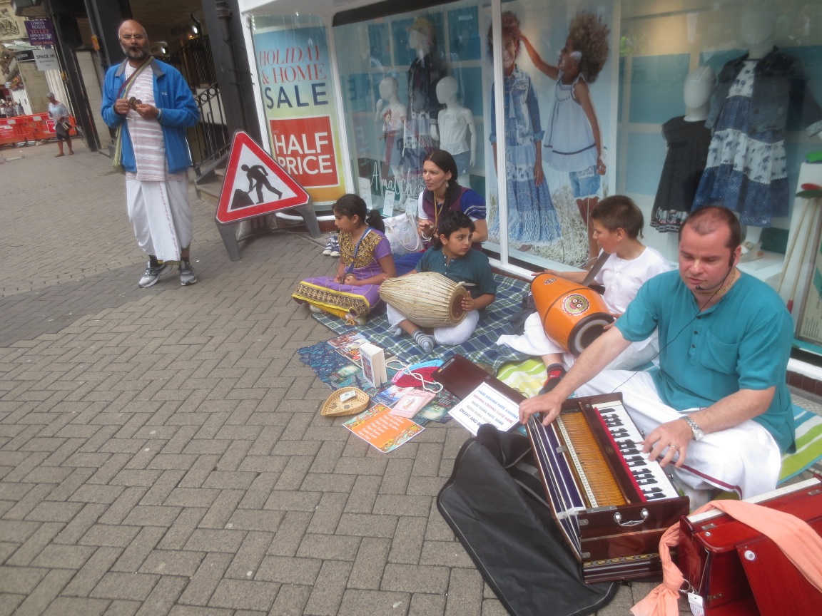 The next day, before our journey to see Janananda Goswami in Leicester, Ashish and I chanted for an hour and a half in York, and it was a pleasant experience. We learned that you cannot play music before 11:00 a.m. in the city center in York on Sunday, so we chanted between the city center and the railway station, which was fairly busy, until 11:00 a.m., and then went to our usual place.